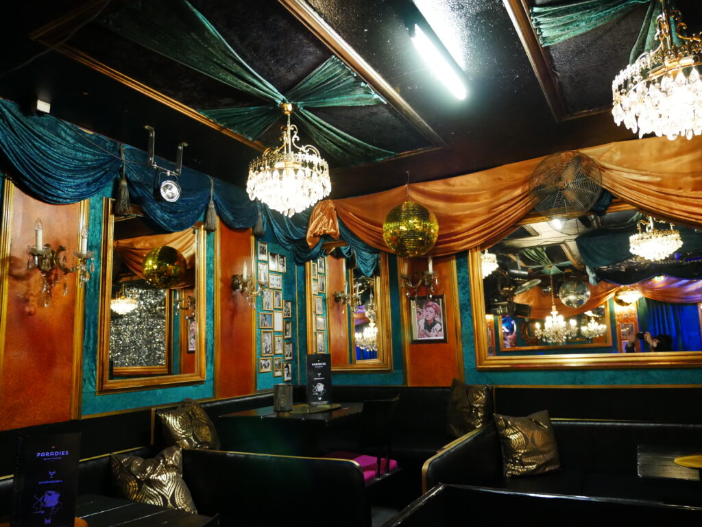 Die starke Verbindung zwischen den beiden ist noch heute überall im „Paradies“ gegenwärtig. An den Wänden erzählen viele Fotos von ihren, wie Thomas Heber es nennt, „27 wunderbaren Jahren“. Selbst die Ansage vom Band, die den Beginn der abendlichen Show einläutet, stammt von Peter Schneider. Zu diesem Zeitpunkt hat sich das „Paradies“ schon längst gefüllt und das Publikum drängt sich um die kleinen Tische. Über ihren Köpfen glitzern die Lüster. Ihr Licht bricht sich in goldumrahmten Spiegeln und taucht viele Meter petrolfarbenen Samt in eine schummrige Stimmung – es ist plüschig-gemütlich im „Paradies“.