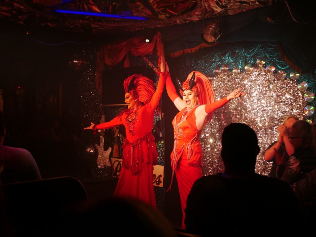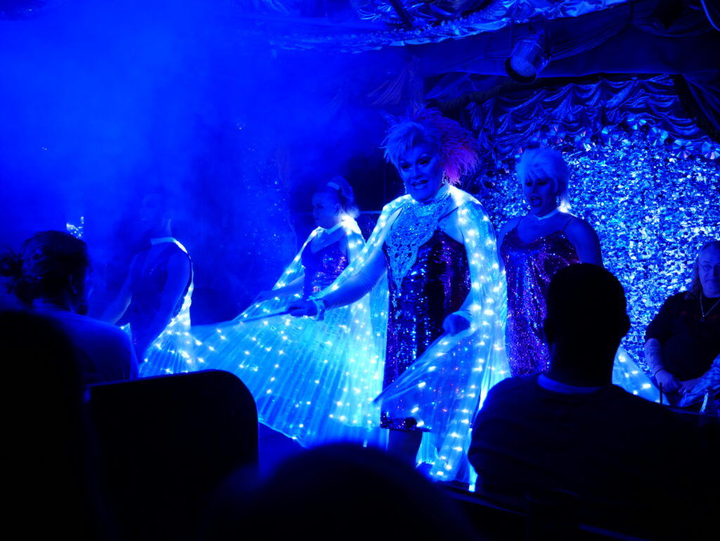 Jetzt ist dafür allerdings keine Zeit, denn backstage verwandeln sich die Künstler:innen in schillernde Geschöpfe der Nacht. Da wird in der engen Garderobe gepudert und gelidstricht, da werden Korsette geschnürt, Perücken und Dekolletés zurechtgerückt und auch mal kleine, liebevolle Gehässigkeiten ausgetauscht.