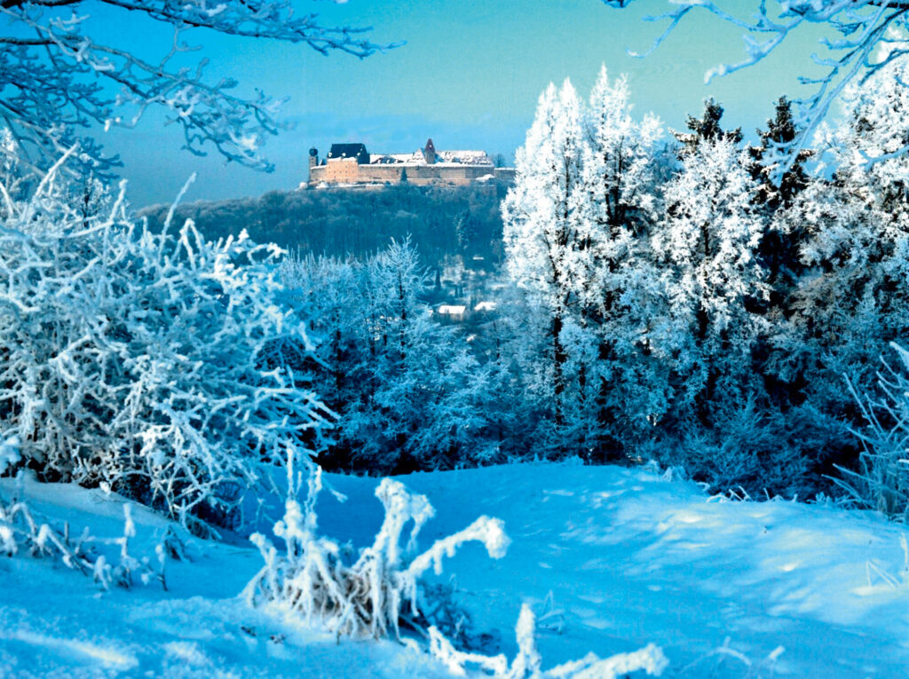Hoch über der Stadt thront die Veste Coburg. Ihre bedeutenden Kunstsammlungen machen sie zu einem kulturellen Schatz – und der Ausblick von der mittelalterlichen Anlage auf die winterliche Stadt und die umliegende Landschaft ist schlicht einmalig. Wenn die Dächer schneebedeckt sind, fühlt sich dieser Ort an wie aus einer anderen Zeit.