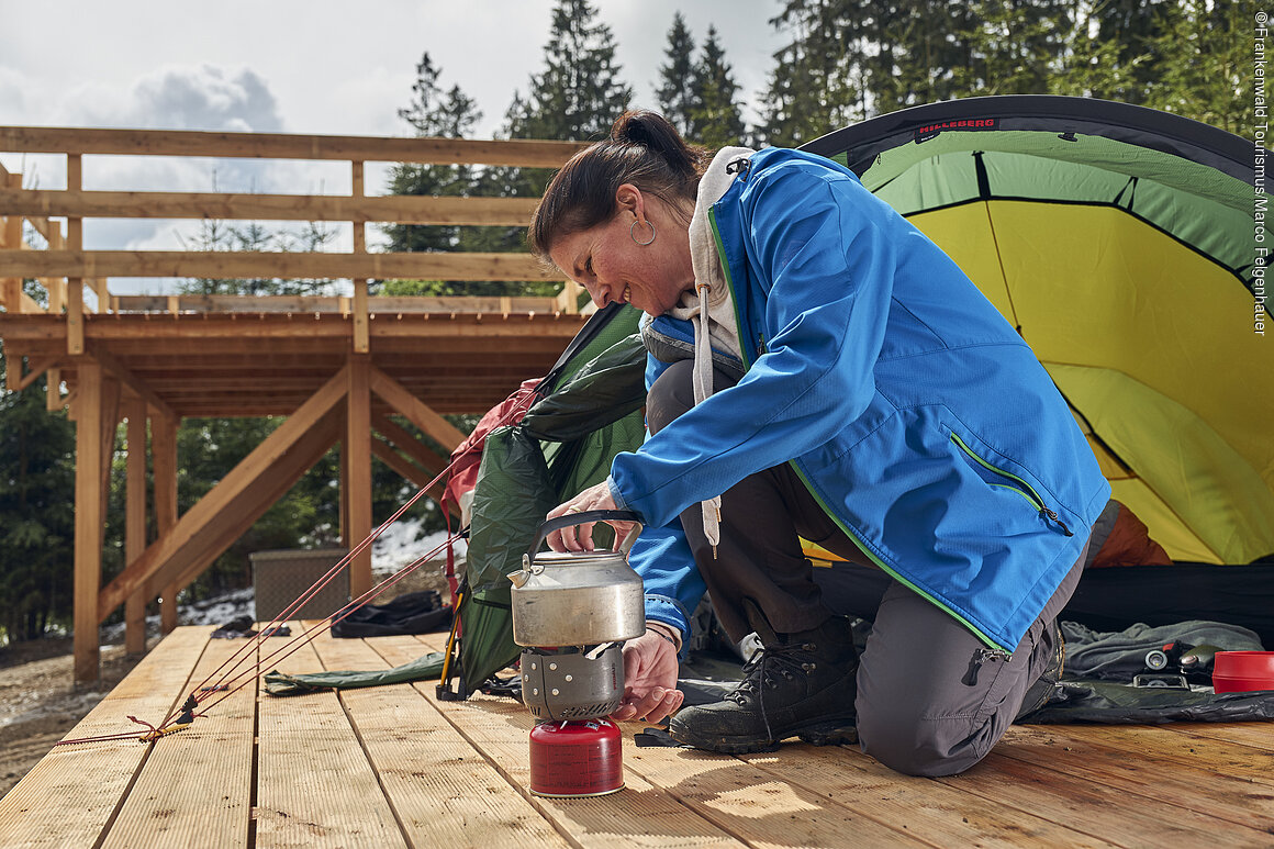 Hierfür gibt es Holzpodeste und Bodenplätze. Ein Brauchwasserfass, eine Feuerstelle und eine Biokompost-Toilette bieten den nötigen Komfort. Trinkwasser und Verpflegung bringen die Trekker, wie bei Naturlagerplätzen üblich, selbst mit. Zum guten Ton gehört, dass anfallender Müll wieder mitgenommen wird. „Es gilt das Prinzip: Hinterlasse nichts außer deinen Fußspuren und nimm nichts mit - außer deinen Eindrücken“, erläutert Markus Franz, Geschäftsführer des Frankenwald Tourismus Service Centers, das für Buchungsanfragen zuständig ist.