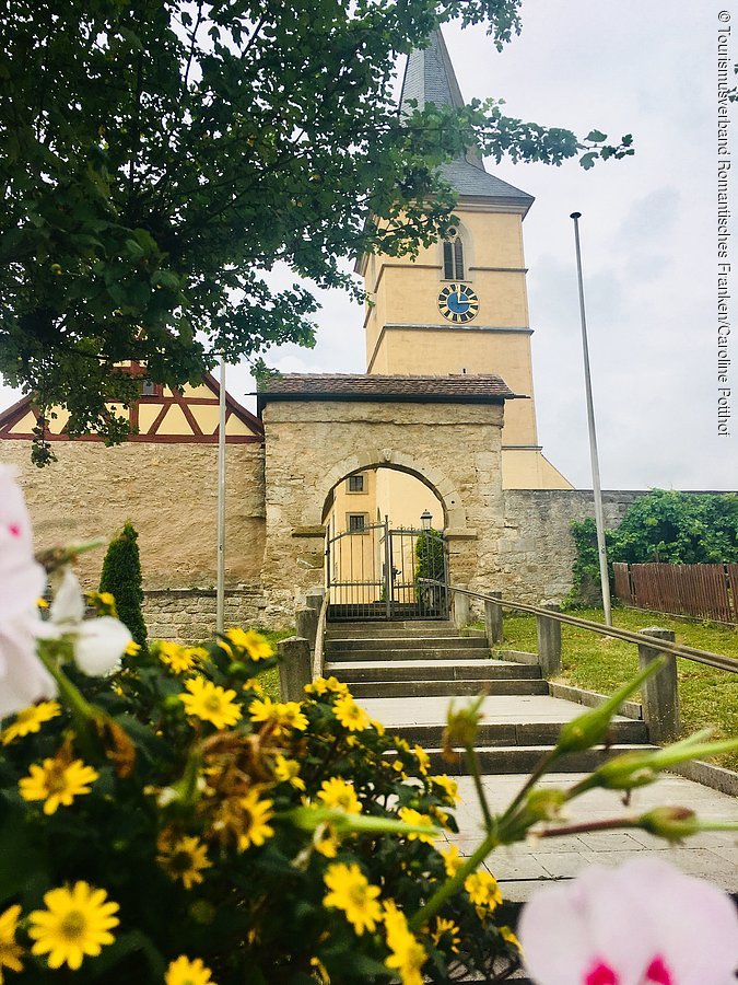 St.-Laurentius-Kirche (verschiedene Baustile), wurde 1108 dem Benediktinerstift Comburg als Eigenpfarrei der Grafen von Rothenburg-Comburg geschenkt.