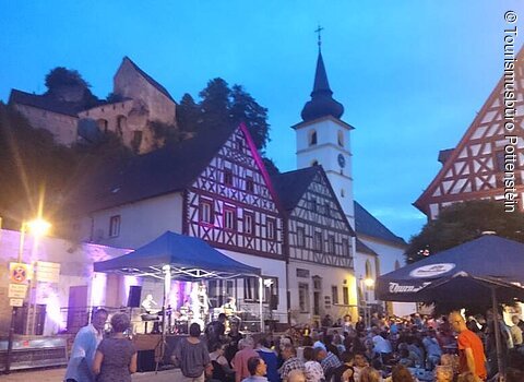 Felsenstädtchen Pottenstein am Zusammenfluß von Püttlach, Weihersbach und Haselbrunnbach. Historische Altstadt (Fachwerk), eingerahmt von mächtigen Dolomitfelsen. 1000jährige Burg als Wahrzeichen. "Nationales Geotop", "Pottensteiner Erlebnismeile - Freizeitzentrum in Nordbayern".