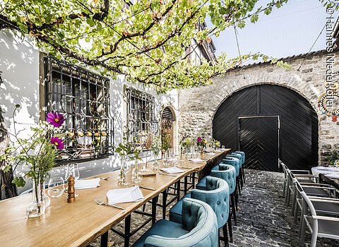 Wer Volkach erkundet, trifft auf fränkische Gastronomie und Gemütlichkeit sowie auf eine große Auswahl an Vinotheken und Weinbars.