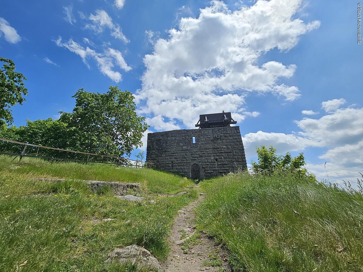 Auf dem unbewaldeten Berggipfel des Bergs Epprechtstein steht auf einer langgestreckten, schroff abfallenden Granitplatte die Burgruine Epprechstein. Es handelt sich um den ehemaligen turmartigen Hauptwohnbau, auf den nun eine Treppe zur Aussichtsplattform führt. Rundblick über den Waldsteinzug, zum Kornberg, nach Schwarzenbach an der Saale und Oberkotzau bis nach Hof, südlich über das Innere Fichtelgebirge zur Kösseine.