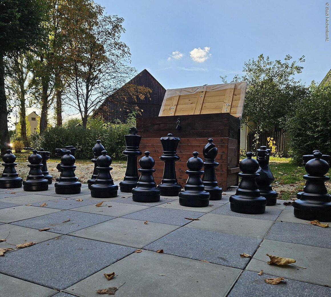 Das wetterfeste Spielfeld mit Figuren, Infotafel und Sitzgelegenheiten lädt zum Spielen und Verweilen ein.
