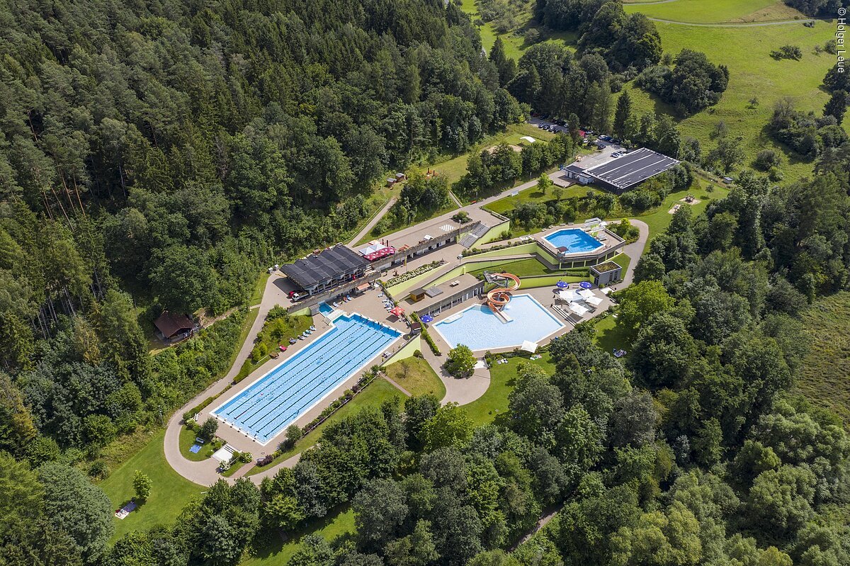 Das Terrassenfreibad liegt idyllisch am Waldrand umgeben von der Natur. Vier großzügige Becken erstrecken sich über drei Ebenen und mehr als 2000 qm Wasserfläche. Mit einer großen Rutsche, einem 50-Meter-Sportbecken, einem Sprungturm und dem beschatteten Kleinkindbecken wird jeder Besuch zu einem besonderen Erlebnis.