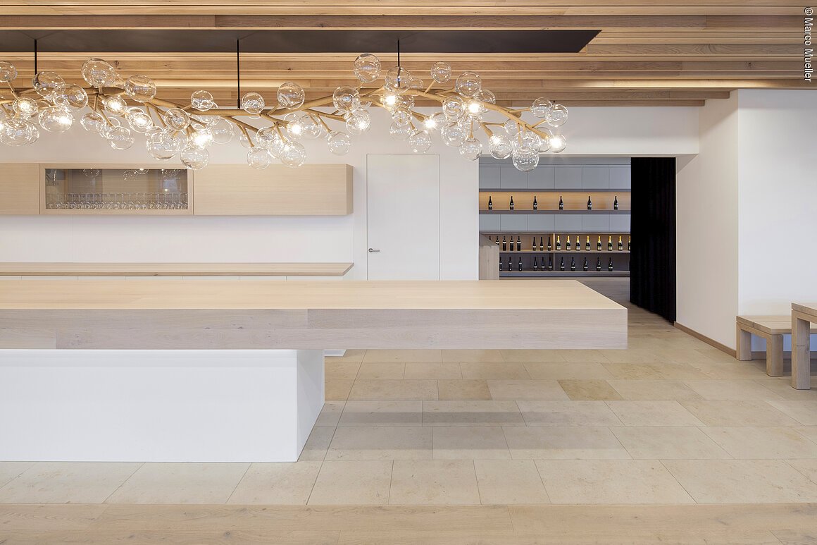 Wie wichtig ein ansprechendes Ambiente für die schönsten Lebensgenüsse ist, weiß Ingrid Behringer wohl. Sie ist mit Begeisterung Käse-Sommelier, Gästeführerin „Weinerlebnis Franken“ und „Dozentin für Wein- und Geschmackskultur“. Das Entree muss Freude bereiten und verheißungsvoll sein, sagt man bei den Behringers dann auch. Für die rechte Dauer des Genusses sorgt die Winzerfamilie seit über 380 Jahren mit ausgewogenen Weinen und mit bestem Wildbret aus der eigenen Jagd. Den Neubau einer modernen Vinothek wollten die Behringers daher gerne mit einem ganz besonderen Auftakt versehen wissen. Der Catwalk zum Wein, der dabei am Ende heraus kam, ist ein Hingucker – nicht nur wenn der Wiebelsberger Dachs die Showbühne betritt. Die Weißweine von dieser Lage und vom Abtswinder Altenberg sind aber gewiss erste Anwärter für einen glamourösen Auftritt auf dem neuen Laufsteg für große Weine und ihre Liebhaber. Der Steg läuft nach zwanzig Metern in einem Laubengang aus, der die Vinothek auf der verbleibenden Länge begleitet. Der Innenraum des Neubaus ist beinahe schon spartanisch nüchtern gestaltet – die Weine stehen eben im Vordergrund. Die Schallschutz-Decke, die sich über die ganze Länge der Vinothek erstreckt und den Baldachin über dem Catwalk ins Haus hinein fortsetzt, ist eine bewundernswerte Schreinerarbeit aus der Region.