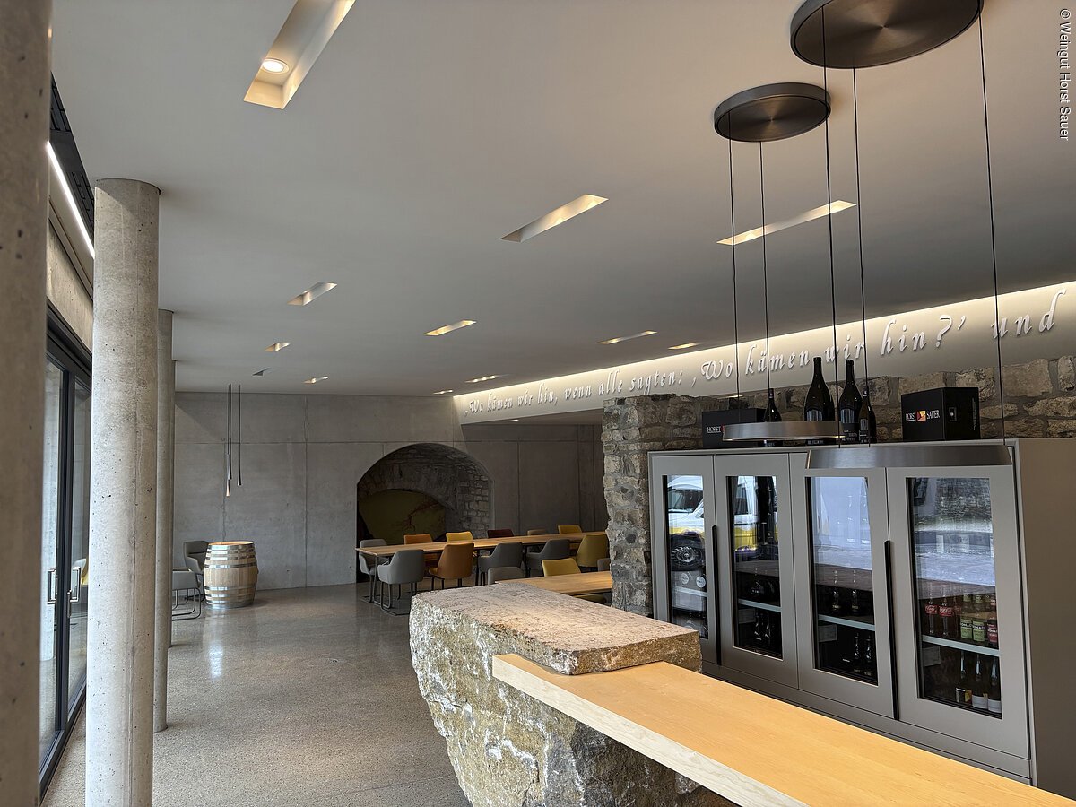 Die Tragkraft des alten Haustocks wurde geschickt genutzt, um Neues darin und darauf anzusetzen. Der Gast trifft im Weingut von Horst und Magdalena Sauer und ihrer Tochter Sandra Sauer, das vor zehn Jahren grundlegend saniert und umgestaltet wurde, auf eine lichte Lobby, an die sich die Verkostungsbereiche anschließen. Am Ende dieses Weges zum Wein stehen in der Schatzkammer die Bimssteinsteigen mit den besten Tropfen darin. Die stammen nicht selten von den Steillagen, die nur wenige Meter hinter dem Anwesen von Horst Sauer beinahe senkrecht zur Vogelsburg hinauf aufsteigen.