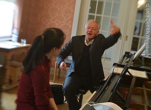 Eine junge Dame bläst in eine Oboe, neben ihr eine Dame, die mit ihr spricht und gestikuliert.