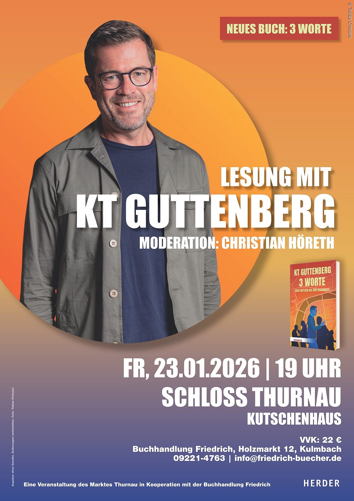 KT Guttenberg liest in Schloss Thurnau aus seinem Buch „3 Worte – Neue Notizen aus der Gegenwart“. Das Buch ist im Herder Verlag erschienen und bietet aus persönlichen Erfahrungen heraus spannende Einblicke in Politik und Gesellschaft. In klugen und unterhaltsamen Essays reflektiert KT Guttenberg über das, was uns im Innersten bewegt: die eigenen Wurzeln, unsere Prägungen sowie unseren Platz im Leben.