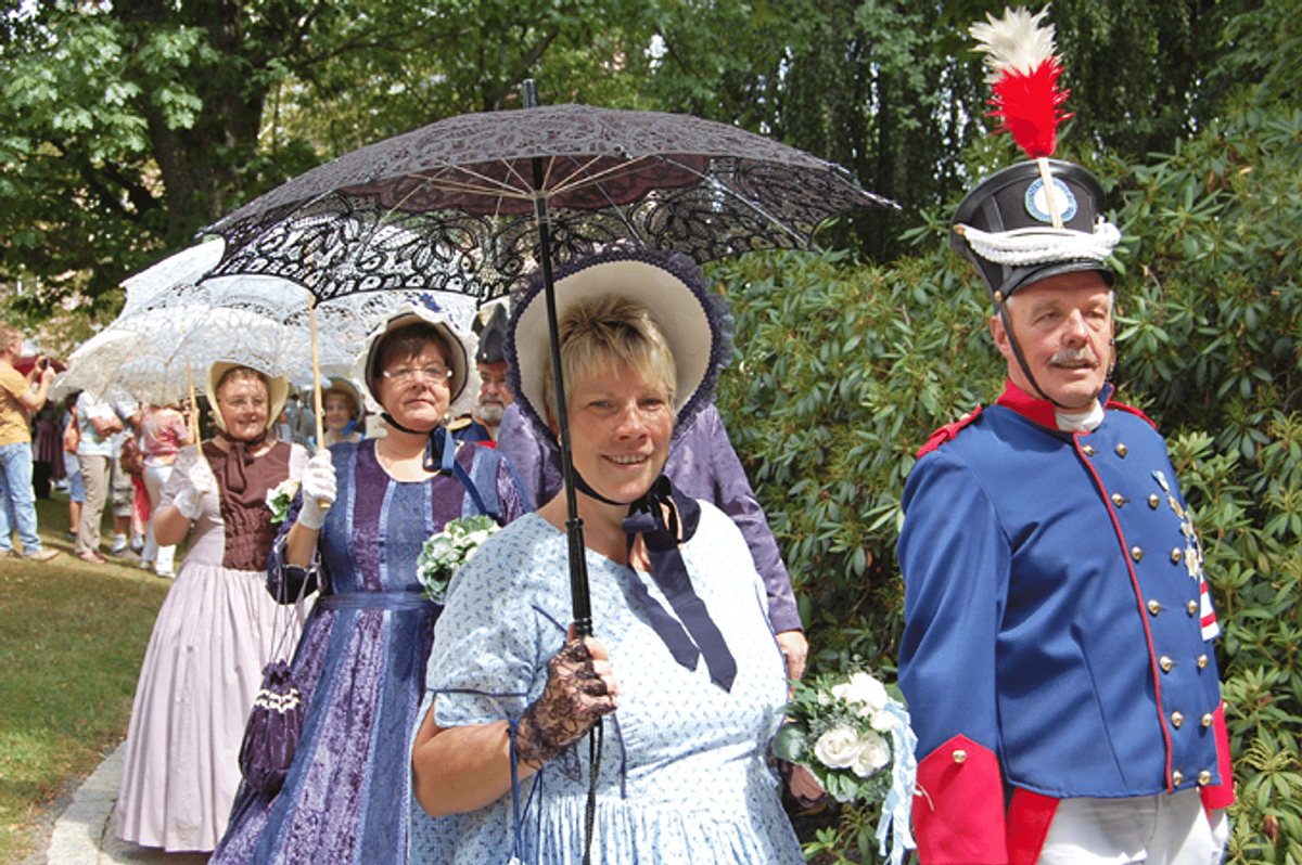 Machen Sie eine Zeitreise und lassen Sie sich in die Zeit des Biedermeiers zurückversetzen. Eine Gruppe Geschichtsbegeisterter flaniert in historischen Gewändern des 19. Jahrhunderts durch den Kurpark. Genießen Sie den Anblick der aufwändig gestalteten Kostüme.In Verbindung mit dem romantischen Flair des Kurparks entfaltet das Flanieren seine ganz besondere Wirkung.