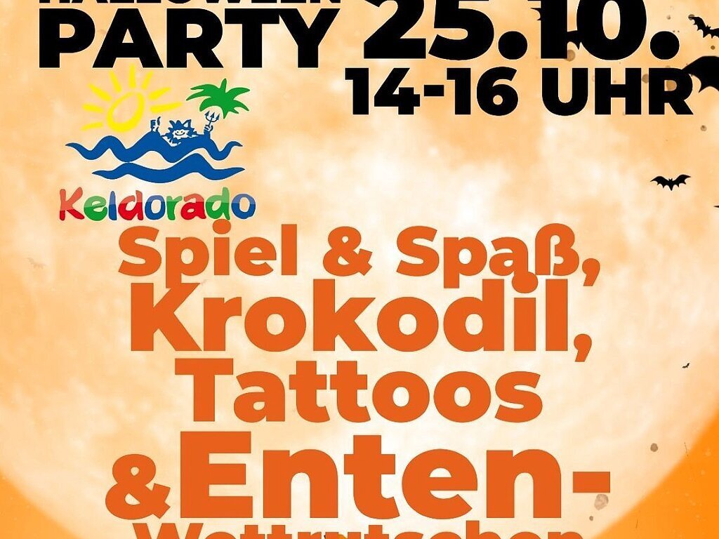 Am Samstag, 25. Oktober 2025 verwandelt sich das KELDORADO von 14:00 Uhr bis 16:00 Uhr in ein schaurig-schönes Halloweenparadies! Kommt vorbei und erlebt zwei Stunden voller Spiel & Spaß, einem wilden Ritt mit dem Krokodil im Wasser, gruseliger Tattoos und einem spannenden Halloween-Enten-Wettrutschen in der Röhrenrutsche "Black-Hole". Tolle Gewinne warten auf Euch!