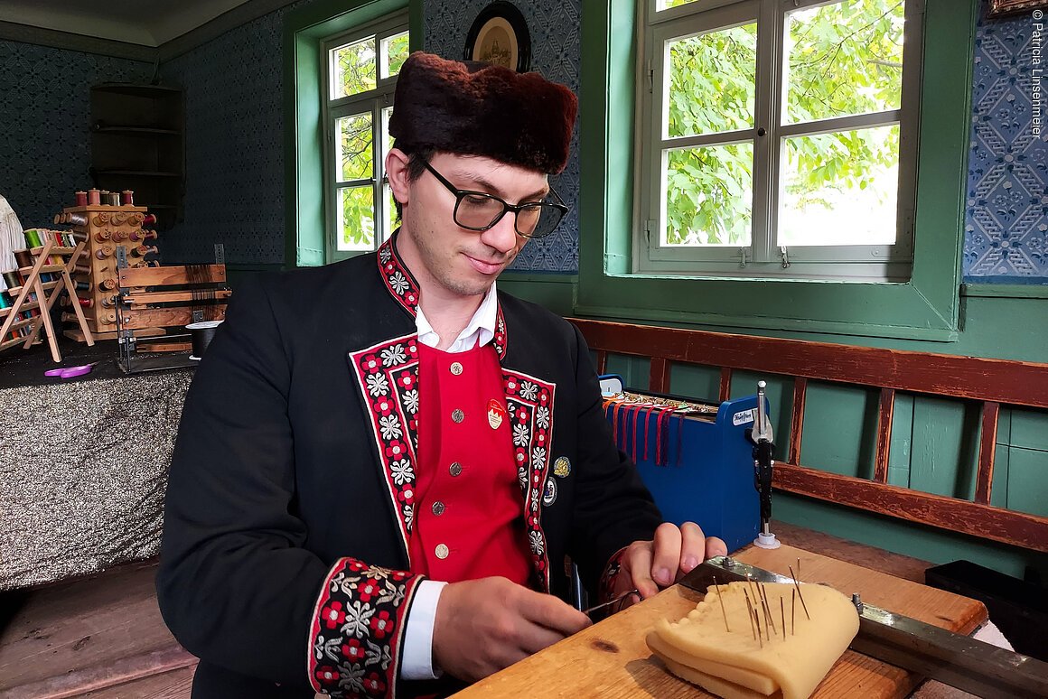 Wie kommen die Fransen an die Tücher von Trachtengruppen? Was ist Perlenstrickerei? Und wie repariere ich meine Kleidung? Schauen Sie den Akteurinnen in verschiedenen Stuben der Museumsgebäude über die Schulter, lassen Sie sich inspirieren oder holen Sie sich den ein oder anderen Tipp für eigene Handarbeitsprojekte. Selbstverständlich können Sie auch individuell gefertigte Einzelstücke erwerben.