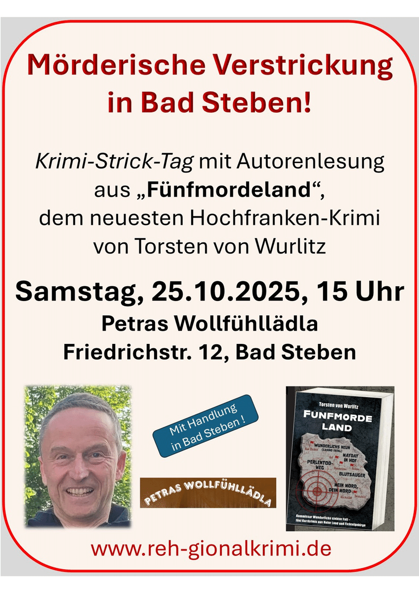 Krimi-Strick-Zeit in Petras Wollfühllädla Der Rehauer Krimiautor Torsten von Wurlitz liest aus seinen spannenden Oberfranken-Krimis und Du lehnst Dich entspannt zurück und strickst dabei. Das Geschäft ist danach noch bis 19:00 Uhr geöffnet. Es gibt eine kleine Pause zur Stärkung mit Kaltgetränken, Snacks, Kaffee und Kuchen. Anmeldung ausschließlich in Petras Wollfühllädla entweder direkt im Geschäft, per Telefon unter 09288 6754 oder per Mail unter info@petras-wolle.de.