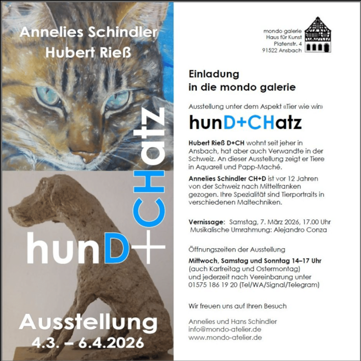Am 4. März beginnt die neue Ausstellungssaison in der mondo galerie an der Platenstraße 4 mit der Ausstellung „hunD+CHatz“. Annelies Schindler und Hubert Rieß zeigen Werke zum Thema „Tier“. Geöffnet ist die Ausstellung jeweils am Mittwoch, Samstag und Sonntag – über die Ostertage täglich – von 14-17 Uhr sowie jederzeit nach Vereinbarung.