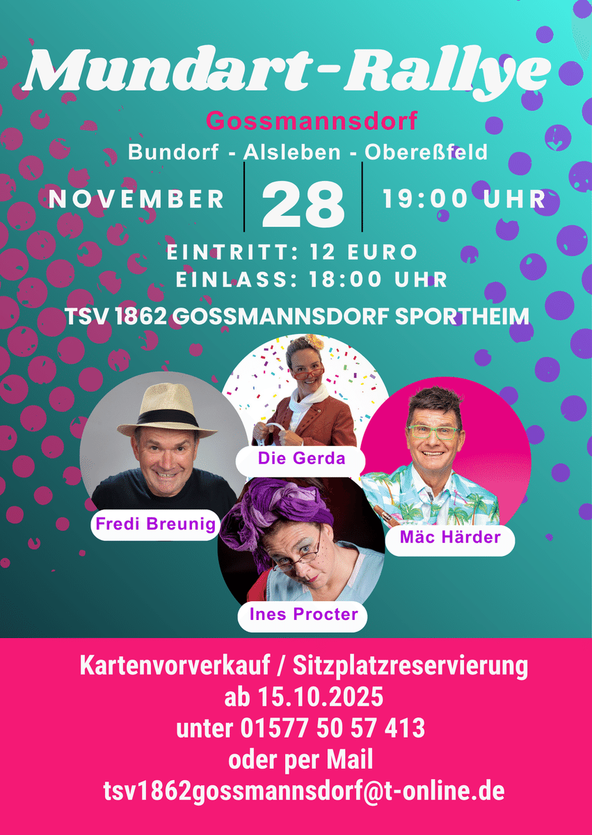 Der TSV 1862 Goßmannsdorf lädt im November 2025 zur Mundartrallye ein. Freuen Sie sich auf einen abwechslungsreichen Abend, der Ihnen viel Freude und gute Stimmung bereiten wird.