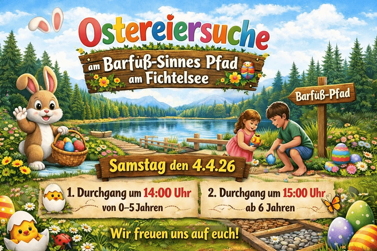 Ostereiersuche am Barfuß-Sinnes Pfad am Fichtelsee  Wo: Ostereiersuche am Barfuß-Sinnes Pfad am Fichtelsee Treffpunkt Pavillon Barfuß-Sinnes Pfad beim Campingplatz. Wann: am 04.04.26 Spielregeln: Pro Runde werden 150 Eier versteckt. Kinder 0-5 Jahre von 14:00-14:45 Uhr (erste Runde) Kinder ab 6 Jahre ab 15:00 -15:45 Uhr (zweite Runde). Jedes teilnehmende Kind sucht nur 1 Ei welches gegen einen Schokohasen eingelöst werden. Außerdem gibt es pro Runde 4 Spezialeier mit besonderen Preisen. Familien mit Kindern sind herzlich eingeladen, wir freuen uns auf euch!