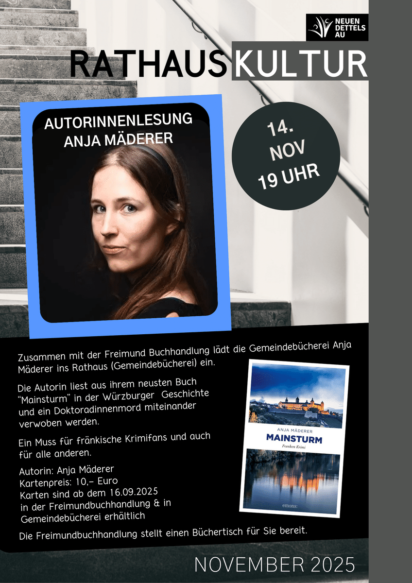 Karten sind ab dem 16.09.2025 in der Freimundbuchhandlung (09874 – 6899590) & in Gemeindebücherei (buecherei@neuendettelsau.eu oder 09874/520-230) erhältlich.