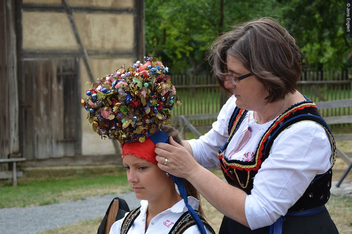 Auf dem Museumsgelände warten außerdem Infostände und Vorführungen zum alten Trachtenhandwerk. In den historischen Häusern sind ausgewählte Trachten aus der Sammlung des Freilandmuseums zu sehen.