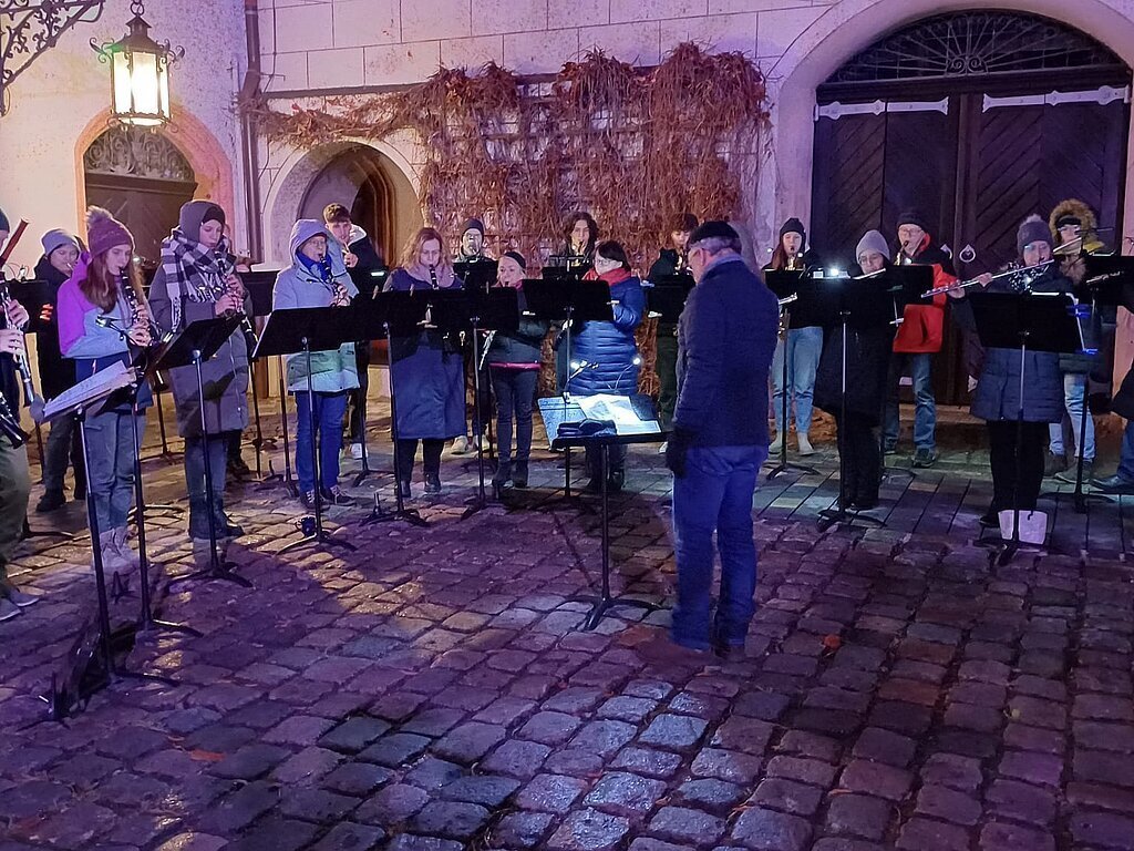 „Wer lieber mitsingen möchte, statt nur zuzuhören, der ist am Mittwoch 17.12. um 19 Uhr im Schlosshof richtig. Hier heißt es wieder "Weihnachtsliedersingen für Alle". Traditionelle und bekannte Weihnachtslieder werden hier gemeinsam gesungen. Egal ob laut oder leise, schief oder schön - hier ist jeder willkommen, mitzusingen.