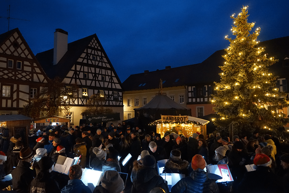 Auch am Sonntag werden die Feuertöpfe und Lichterketten wieder entfacht. Nicht nur rund um den Marktplatz sorgen dann Verkaufsbuden für eine stimmungsvolle Atmosphäre vor historischer Kulisse – auch entlang der Überkumstraße bis zum Bürgerhaus Lechner Bräu präsentieren Kunsthandwerker weihnachtliches und viele andere festliche Dekorations- und Geschenkideen. Genießen Sie beim Bummeln Bratwürste, Waffeln, Glühwein und vieles mehr von einem der traditionellen Ständen. Bei diesem großen Angebot wird sicher jeder fündig! Die Stadtbücherei bietet einen großen Bücherflohmarkt zum Stöbern an. Für stimmungsvolle Musik sorgen an diesem Tag die Sendelbachtaler Musikanten und die Stadtkapelle Baunach.
