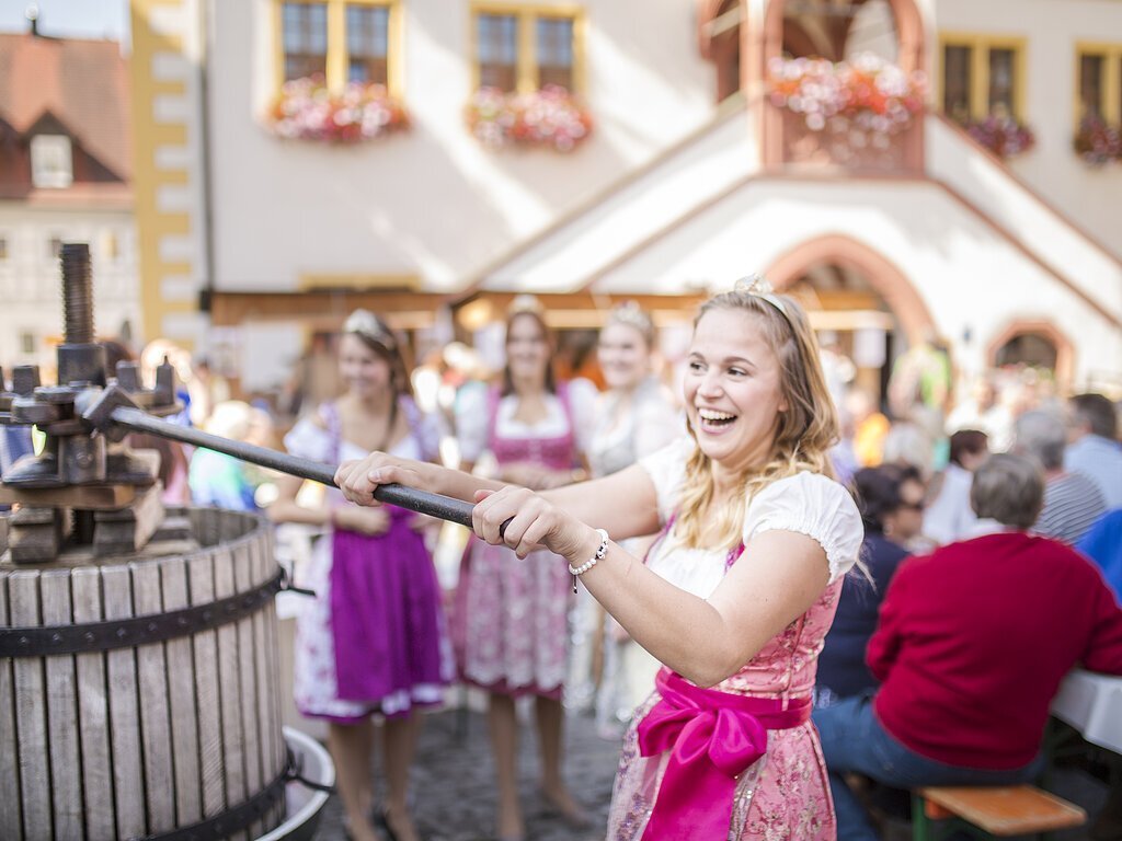 Es wird allerhand geboten und dabei der Bogen von der Tradition zur Moderne geschlagen. Unter dem Motto „Symbolisches Weinpressen“ sind beispielsweise die Volkacher Weinprinzessin und der Volkacher Ratsherr mit alten Weinbau-Gerätschaften aktiv.